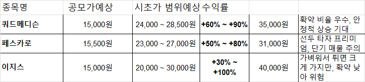 균등 청약: 자금 여유가 되신다면 3종목 모두 균등(최소 수량)은 참여하시는 게 좋습니다. (배정 확률이 낮더라도 수익은 줄 가능성이 높음)
