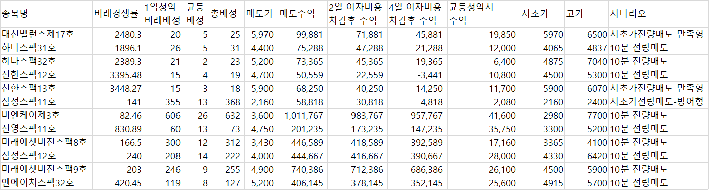 뭐 ... 그게 아니더라도 일반 공모주 비례 할게 하나도 없다면 한 5분걸린다면 소액벌이로 할만하다. 만약 가격이 조금 삐끗한다면 균등은 수수료 2000원만 나가면 되지만 비례는 2일에 이자 26000원(마통1억땡겨서 비례들어갈 경우)이 나가기 때문에 별로다. 경쟁률이 1000이 넘어가면 걍 균등만 하면 맘 편할듯 하다. 경쟁률이 500 아랫것들은 왠만한 대박 비례보단 낫다 ㅎㅎ. 이럴경우 차라리 일반공모주보다 스펙을 하는 것이 좋은 선택일 수 있다.