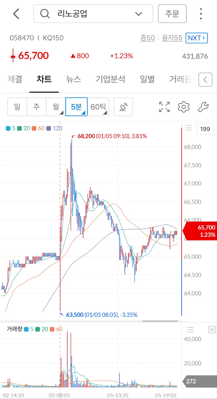 *그리고 오늘 출근해서 내차로 카풀을 하여 운전하면서 휴대폰 볼 시간도 없었고 출근해서 전에 알파스퀘어 종목발굴을 통해 미리 찍어둔 리노공업 시초가 매수를 했다. (알파스퀘어 종목발굴 및 차트게임 글 일일매매 + 알파스퀘어 차트게임 , TRIX 전략 )